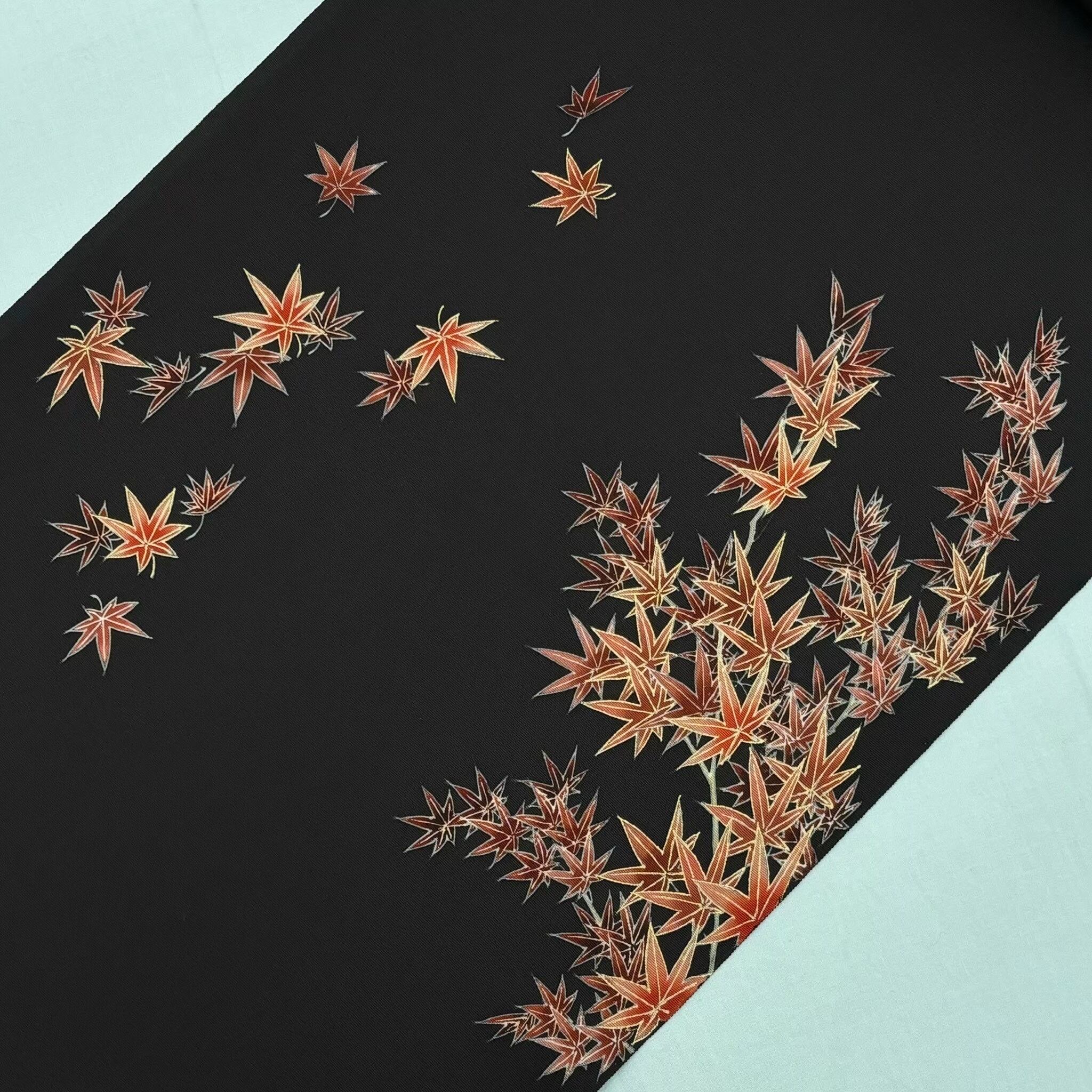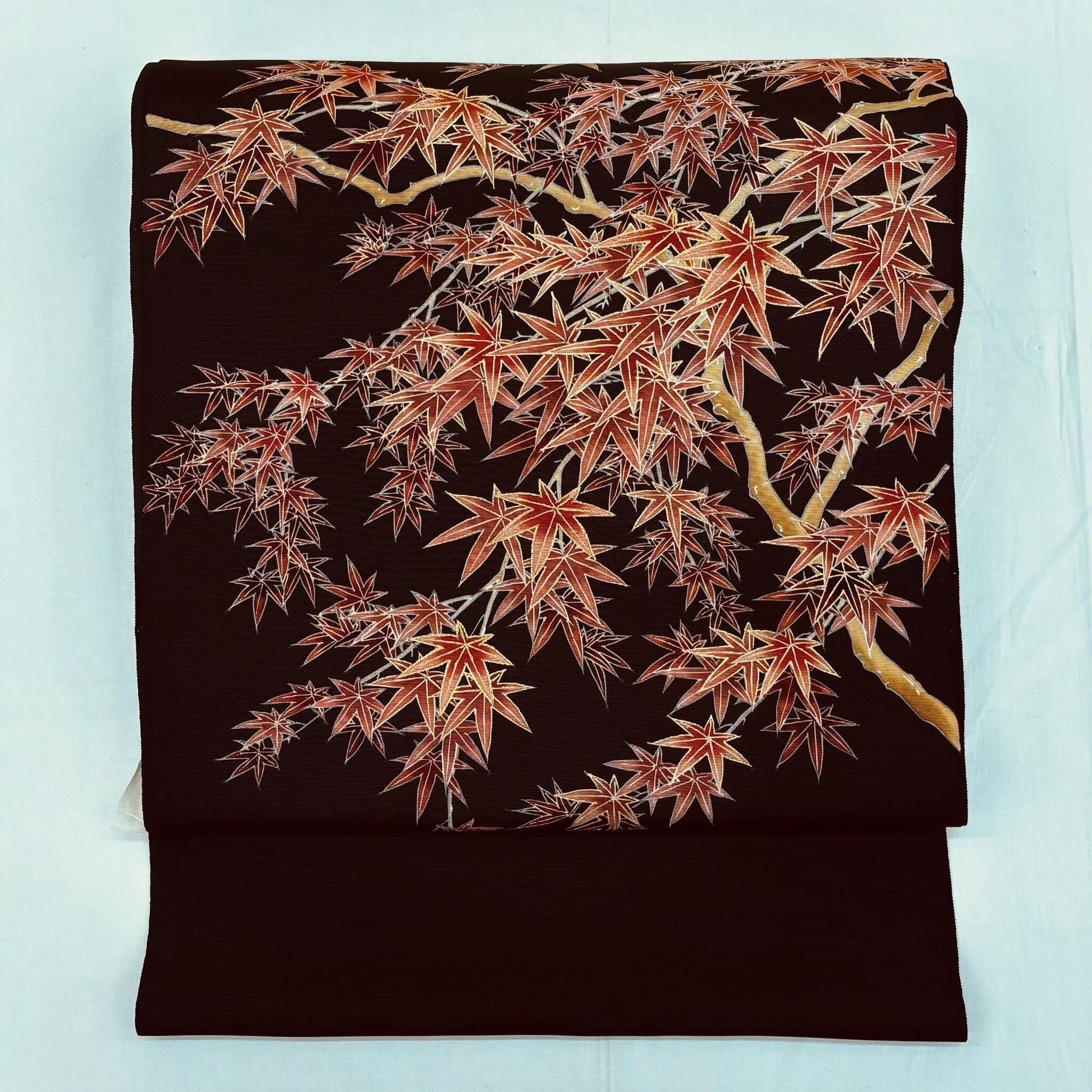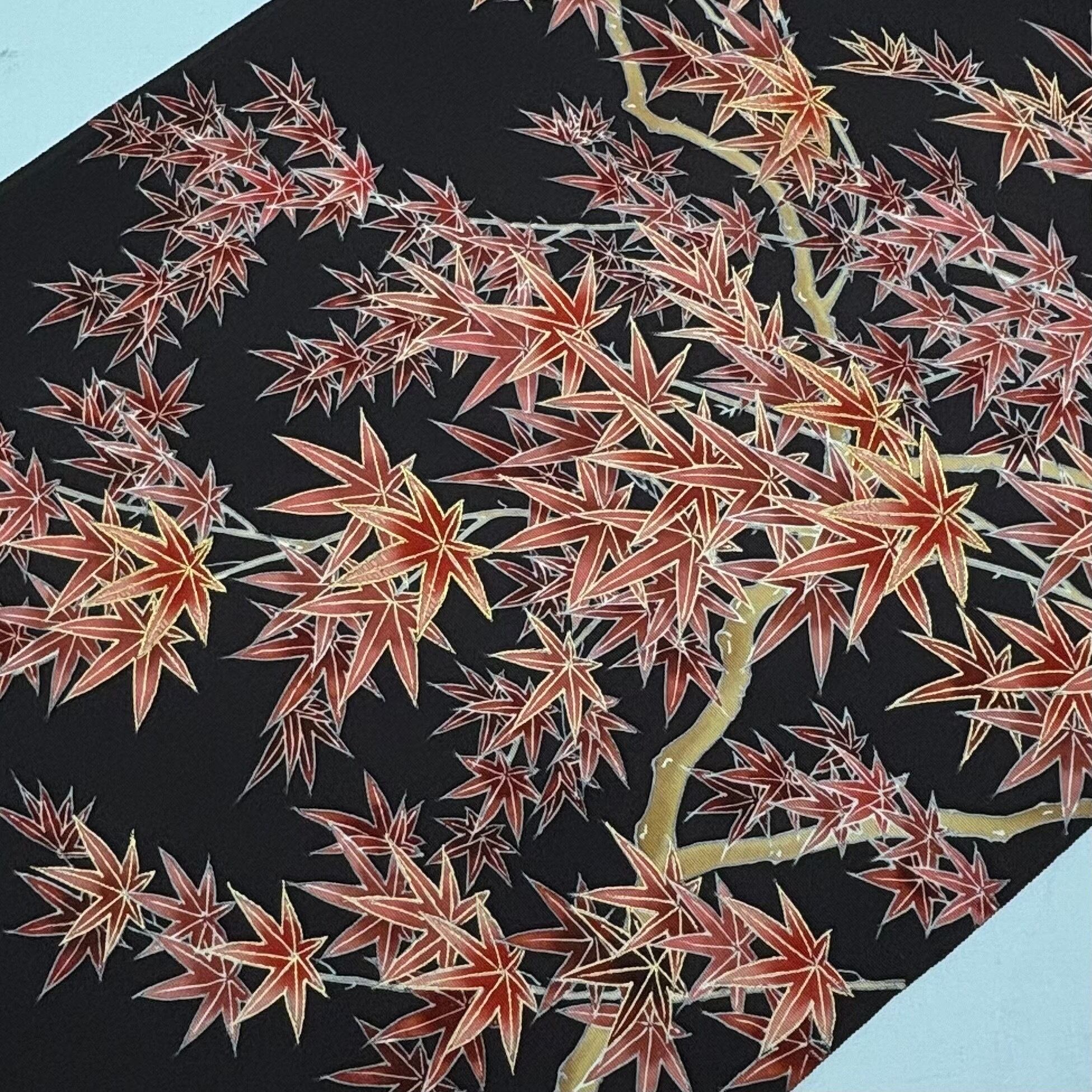 秋の訪れを美しく表現した名古屋帯です。鮮やかな紅葉のデザインが施され、和装に季節感を添えることができる特別なアイテムです。普段の着物はもちろん、特別な行事やお出かけにもふさわしい一品です。