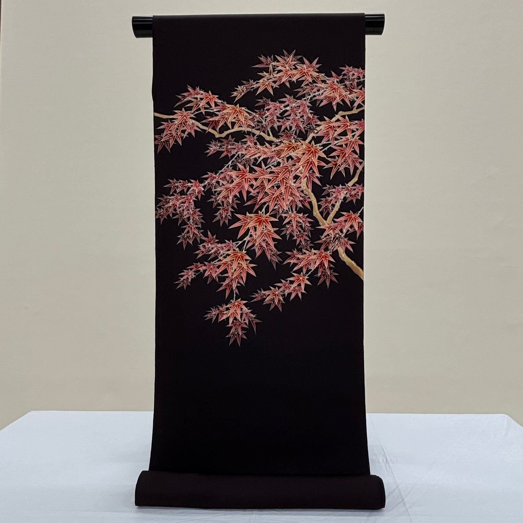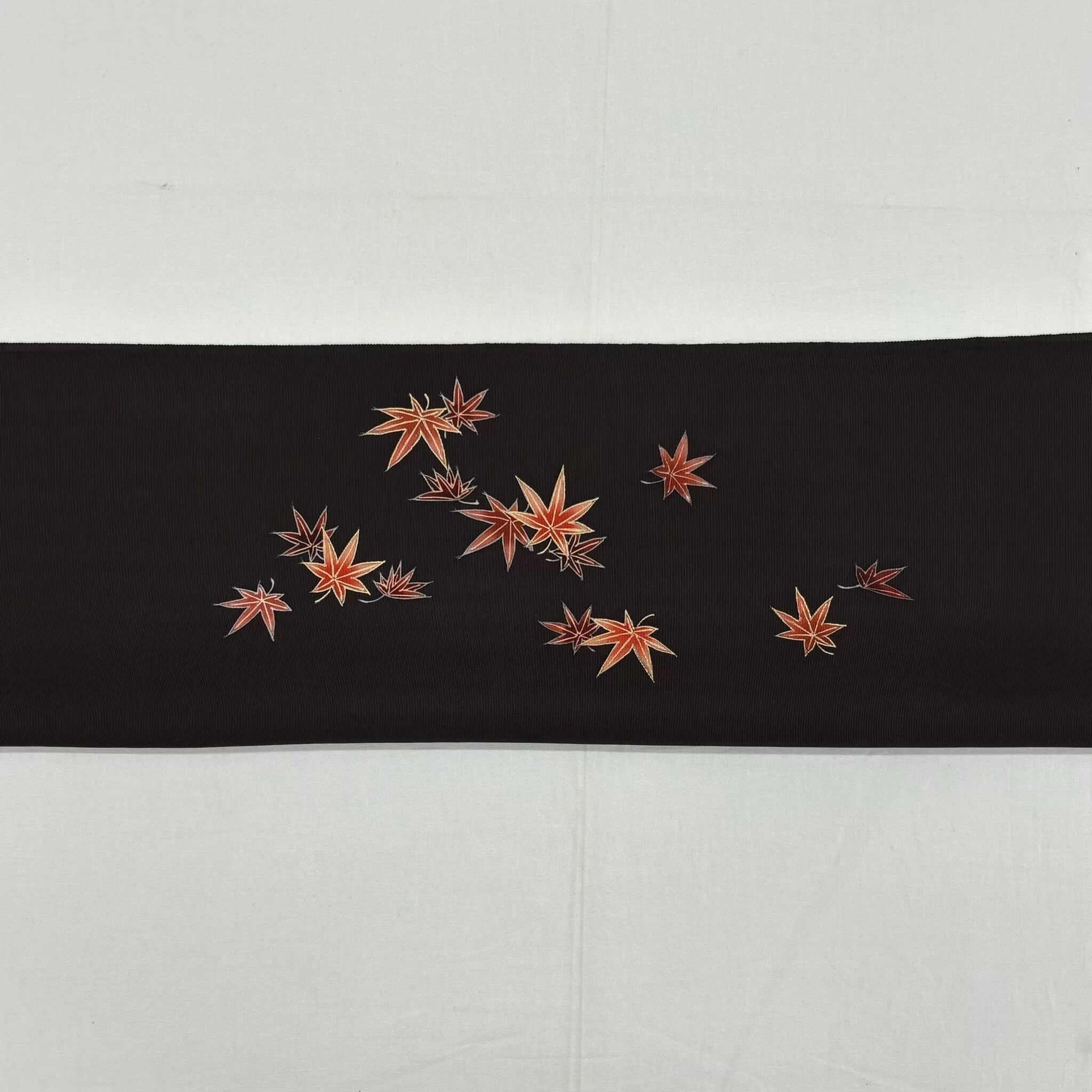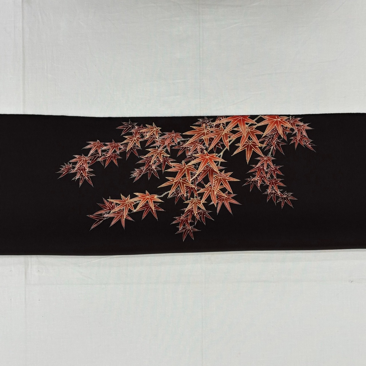 秋の訪れを美しく表現した名古屋帯です。鮮やかな紅葉のデザインが施され、和装に季節感を添えることができる特別なアイテムです。普段の着物はもちろん、特別な行事やお出かけにもふさわしい一品です。